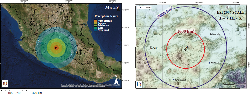 Figure 9 a) Perception area for a moderate event with magnitude Mw 5.9 and epicenter in the La Alberca-Teremendo fault. b) Areas prone to develop environmental effects during an earthquake with intensities between VIII - X (1000 km2-5000 km2). Numbers indicate Mexico states: 1 = Michoacán; 2 = Estado de México; 3 = México City; 4 = Querétaro; 5 = Guanajuato; 6 = Jalisco.