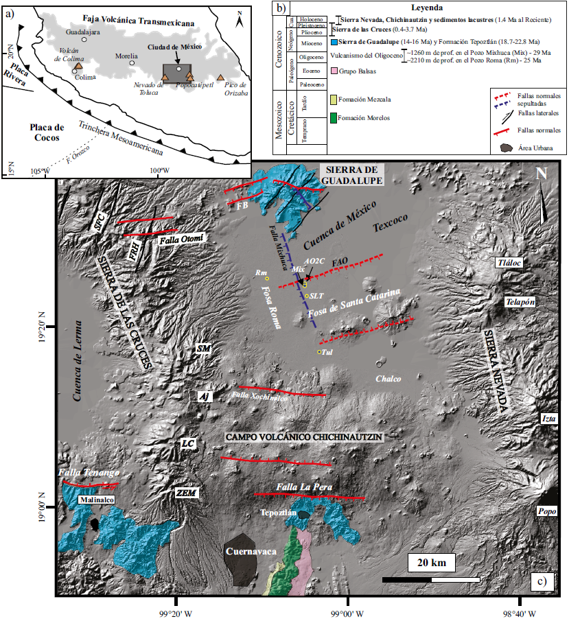 Figura 1. a) Mapa tectónico del centro-sur de México donde se muestra a la Faja Volcánica Transmexicana y la ubicación de la cuenca de México en el cuadro gris (Modificado de Arce et al., 2013). b) Columna estratigráfica representativa de la cuenca de México. c) Modelo digital de elevación que representa el cuadro gris de inciso a, donde se aprecian las sierras volcánicas que rodean a la cuenca de México, las principales fallas geológicas reportadas en trabajos previos (Alaniz-Álvarez et al., 1998; García-Palomo et al., 2008; Arce et al., 2013; Lermo et al., 2016) y los afloramientos de las rocas del Mioceno estudiados; así mismo, se incluye la ubicación de los pozos: AO2C-Agrícola Oriental: 19°23’43.25"N, 99° 5’11.01"W, Mix-Mixhuca: 19°23’19’’N, 99°05’17’’W; SLT- San Lorenzo Tezonco: 19°22’44.18’’ N; 99°05’05.10’’W; Tul-Tulyehualco: 19°17’05’’ N; 99°03’37’’W; Rom-Roma: 19°24’33.90" N 99°09’26.08"W; SC-Santa Catarina 3A: 19°17’45.84"N, 99° 4’55.64"W. Las estructuras volcánicas son: SM-San Miguel, AJ-Ajusco, LC-La Corona, ZEM-Zempoala, Izta-Iztaccíhuatl, Popo-Popocatépetl (Arce et al., 2019; Macías et al., 2012) y estructuras tectónicas: FB-Fosa Barrientos, SFC-Sistema de Fallas Catedral, FRH-Falla Río Hondo (García-Palomo et al., 2008), FAO-Falla Agrícola Oriental (en este trabajo). Se indican las fuentes de las edades de las siguientes formaciones o rasgos topográficos: Lenhardt et al. (2010) para la Fm. Tepoztlán; Lozano-Barraza (1968) para la Sierra de Guadalupe y la compilación hecha por Arce et al. (2008; 2019) para la Sierra de las Cruces y Cuenca de México.