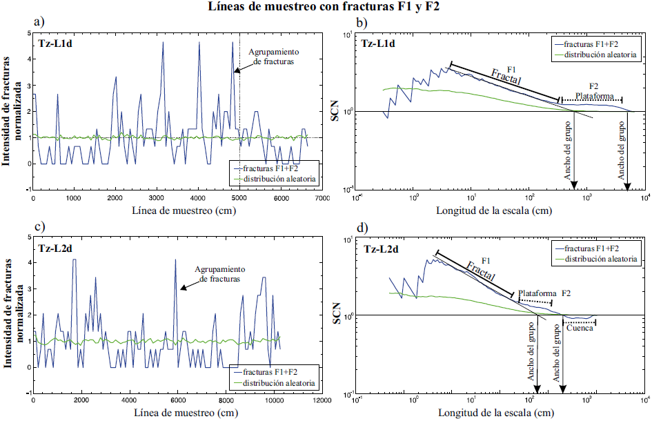 Figura 10. Gráficos de intensidad de fracturas normalizado (a, c) y suma de correlación normalizada (b, d) para 2 líneas de muestreo que incluyen a las fracturas F1 y F2. En las curvas de suma de correlación normalizada es posible apreciar la formación de dos patrones. En la longitud de escala menor es posible apreciar una distribución fractal de los grupos de fracturas asociada con las fracturas F1; mientras que el patrón de plataforma y/o cuenca en escalas mayores se relaciona con la presencia de grupos de fracturas de la familia F2.