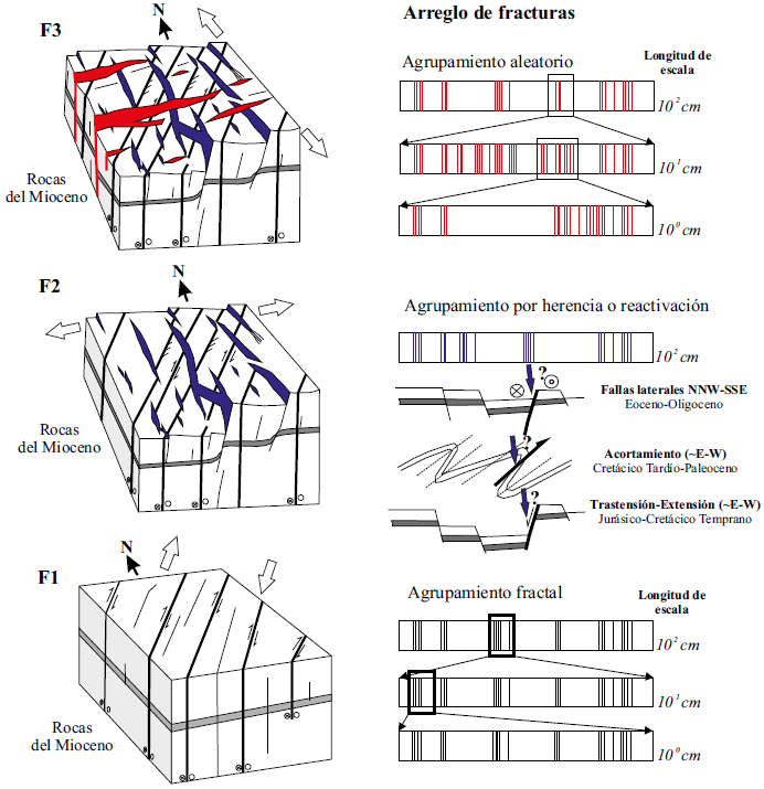 Las familias de fracturas que afectan a rocas del Mioceno en la cuenca de México están asociadas a tres eventos de deformación. Las fracturas F1 se generaron en un evento que involucra fallas de desplazamiento lateral derecho NE-SW activas en el Mioceno (Vásquez-Serrano et al., 2018b). Esta familia se caracteriza por formar grupos de fracturas que tienen una distribución fractal relacionada con la formación de una recta en el gráfico log-log de la longitud de la escala contra la suma de correlación normalizada (Figuras 9 y 11). El segundo evento (Mioceno) se asocia con fallas normales que tienen un rumbo NNW-SSE, las cuales formaron fracturas (F2) cuyo arreglo se relaciona con herencia estructural o reactivación de estructuras previas (Figura 11). Esto es soportado con los gráficos de suma de correlación normalizada y con la orientación que tienen las fracturas F2. Finalmente, un evento de extensión N-S genera fallas normales que son activas actualmente y que produce una serie de fracturas (F3) que tienen un arreglo agrupado aparentemente con una distribución aleatoria en, por lo menos, dos órdenes de magnitud de escala (Figuras 10 y 11).