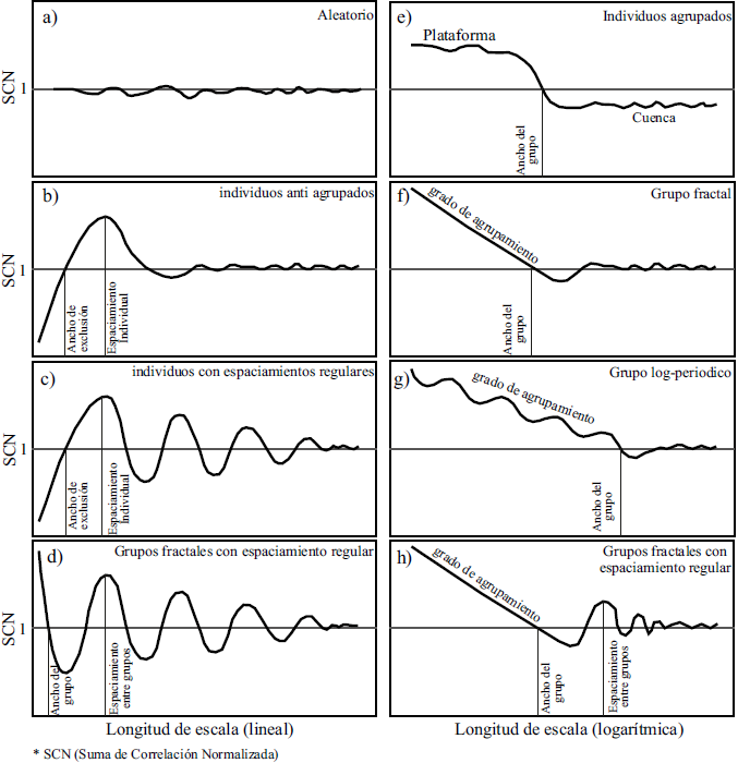 Figura 3. Patrones de la variación de suma de correlación normalizada (SCN) con la escala en formato lineal y logarítmico. a) La formación de una forma plana indica que no existe una organización estadísticamente significativa. b) Fracturas no agrupadas, pero sin espaciamiento constante. c, d, h) Patrón con altos y bajos que se relaciona con espaciamiento regular (igual espaciamiento). f, g, h) Variación asociada a una ley de potencia en el agrupamiento de fracturas con la escala (comportamiento fractal), dicho patrón se observa mejor en el eje logarítmico de la escala. e) Formación de plataforma y cuenca que indica agrupamiento de fracturas relacionadas con procesos de herencia estructural y/o reactivación. Modificado de Marrett et al. (2018).