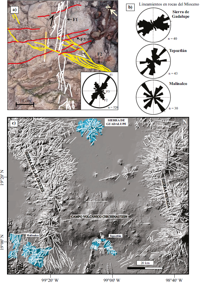 Figura 4. a) Datos estructurales de fracturas medidos en campo (diagrama de rosa) y familias de fracturas (F1, F2 y F3) que afectan a las rocas del Mioceno de la cuenca de México (Fotografía de un afloramiento de la Sierra de Guadalupe). b) Diagrama de rosa de lineamientos morfológicos de los sitios en donde se exponen rocas del Mioceno dentro (Sierra de Guadalupe) y en los alrededores (Malinalco y Tepoztlán) de la cuenca de México. c) Mapa de lineamientos morfológicos en la cuenca de México, elaborado con base en la metodología propuesta por Marshak y Mitra (1988).