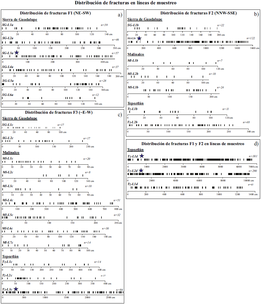 A escala de afloramiento, en cada sitio estudiado (Sierra de Guadalupe, Malinalco y Tepoztlán) se observó la presencia de tres familias de fracturas (F1, F2 y F3) subparalelas a los lineamientos morfológicos a escala kilométrica (Figura 4). La distribución espacial de las fracturas en las líneas de muestreo, revela que cada familia de fracturas tiende a formar grupos, sobre todo en aquellos lugares donde hay presencia de fallas (Figura 5). Este comportamiento en la distribución espacial de las fracturas parece ser independiente del tipo de roca. Tanto en depósitos volcaniclásticos como en paquetes de lavas predomina la tendencia a formar grupos de fracturas observables en las líneas de muestreo de diferente longitud (Figura 5). En las líneas de muestreo que incluyen a dos familias de fracturas (líneas de muestreo combinadas) es posible observar de manera cualitativa un incremento en el grado de agrupamiento (Figura 5d), contrario a lo que se observa en líneas que incluyen a una sola familia (Figura 5a, 5b, 5c).