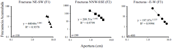 Figura 6. Gráfico bilogarítmico del tamaño de la apertura contra su frecuencia acumulada para las fracturas F1, F2 y F3.
