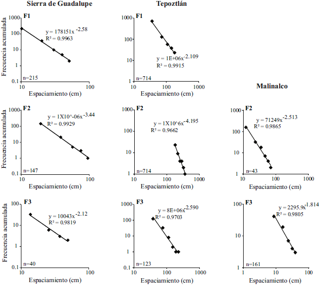 Una manera de analizar la abundancia de la apertura y el espaciamiento un rango de escala dado es mediante un gráfico bilogarítmico frecuencia acumulada contra el tamaño, donde la pendiente (exponente de frecuencia acumulada) mostrará la proporción cantidad-tamaño de estas variables. Tomando en cuenta todos los datos de apertura colectados en los tres sitios de estudio (Sierra de Guadalupe, Malinalco y Tepoztlán), ésta variable muestra un comportamiento fractal, ya que sigue una ley de potencia. Las fracturas F1 tienen el exponente de frecuencia acumulada más alto con un valor absoluto de 5.061, mientras que las fracturas F2 presentan el valor más bajo con 1.692. Para las fracturas F3 se obtuvo un exponente de frecuencia acumulada de 2.227 (Figura 6). Aunque el exponente de frecuencia acumulada para F1 tiene un valor alto en comparación con otros datos de apertura reportados (Hooker et al., 2013), un aspecto que hay que tomar en cuenta es que nuestro estudio toma en cuenta no sólo a las fracturas extensionales, sino que incluye a los otros modos de fracturas, lo cual puede explicar el valor anómalo de F1. El espaciamiento en las tres familias de fracturas también tiene un comportamiento fractal, demostrado por la línea recta en la pendiente que se dibuja en los gráficos de frecuencia acumulada contra espaciamiento de la Figura 7 (función de ley de potencia). En los tres sitios estudiados, las fracturas F2 presentan los valores más altos en el exponente de frecuencia acumulada (2.51 a 4.19), mientras que las fracturas F1 y F3 tienen valores similares (1.81 a 2.59).