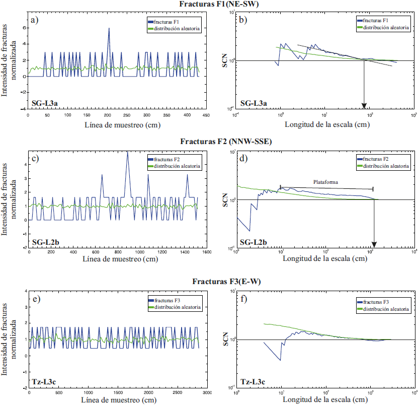 Para analizar de manera más detallada a los grupos de fracturas, se procedió a graficar la suma de correlación normalizada (SCN) en un gráfico bilogarítmico contra la escala (Figura 8). En este mismo gráfico se incluye la variación de la intensidad de fracturas (normalizada) a lo largo de las líneas de muestreo seleccionadas para el análisis (Figura 8). Si se compara el patrón obtenido en la SCN para cada familia de fracturas (F1, F2 y F3) con lo que se observa en la Figura 3, es posible distinguir ciertas características en el arreglo de los grupos de fracturas de cada familia. Las fracturas F1 muestran la formación de una pendiente en el grafico bilogarítmico de la Figura 8b, lo que sugiere que la distribución espacial de los grupos se comportan como un fractal, es decir, son autosimilares y la relación frecuencia-tamaño sigue una ley de potencia. El tamaño máximo de los grupos de fracturas F1 es de aproximadamente 80 cm en por lo menos dos órdenes de escala (Figura 8b). En el caso de las fracturas F2, éstas generan un patrón de meseta que se aleja de una tendencia aleatoria. Esta meseta (plataforma) abarca por lo menos dos órdenes de escala (101-103) con un tamaño máximo de los grupos de 110 cm (Figura 8d). Para ambas familias de fracturas (F1 y F2) se observa la formación de picos pronunciados en los gráficos de intensidad de fracturas normalizada, lo cual es congruente con la formación de grupos de fracturas muy marcados en las líneas de muestreo. Finalmente, las fracturas F3 se ajustan a una distribución espacial aleatoria de los grupos de fracturas dentro del rango de escala estudiado (Figura 8f), esto es corroborado en el gráfico de intensidad de fracturas normalizada donde no se observa ningún pico importante (Figura 8e).