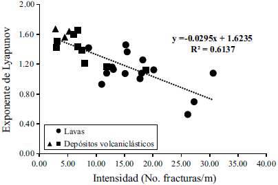 Además de los parámetros fractales antes descritos, también se calculó la intensidad de fractura (número de fracturas por unidad de longitud) en cada línea de muestreo. En general, la intensidad de fracturas varía entre 2.82 y 30.61 fracturas/m en las tres familias de fracturas (F1, F2 y F3). El valor de la intensidad tiene una relación muy clara con el tipo de roca, siendo las lavas (andesita) las que presentan los mayores valores (8.66 a 30.61) y los depósitos volcaniclásticos los que tienen los valores más bajos (2.82-7.99). Es importante mencionar la relación inversa que guarda la intensidad de fracturas con el exponente de Lyapunov, como se observa en la Tabla 1; cuando la intensidad es baja el valor de este parámetro es alto.