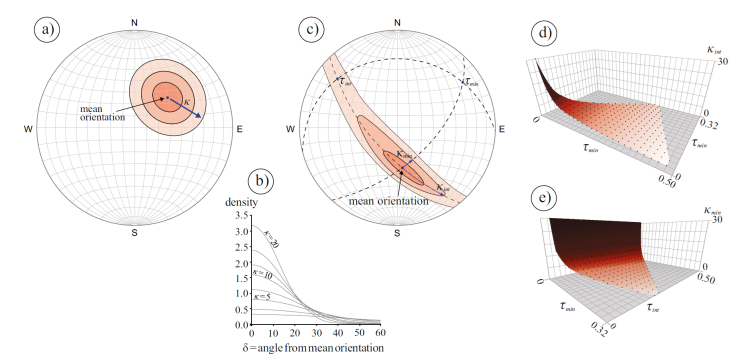 Figure 1 Distribution models: a) Fisher distribution: circular-symmetrical cluster of orientations. Its confidence cone is circular on the sphere. b) Probability density of Fisher distribution for different Fisher kappa (κ) vs. the angular distance (δ) from mean orientation. c) Bingham distribution has a cluster of orientations that does not possess circular symmetry but rather an orthorhombic symmetry. Density contours range in shape from ellipses to complete great-circle girdles. d) and e) show the concentration parameters variation (κ int and κ min ) in function of normalized eigenvalues τ 2 and τ 3. Modified from (Borradaile, 2003).