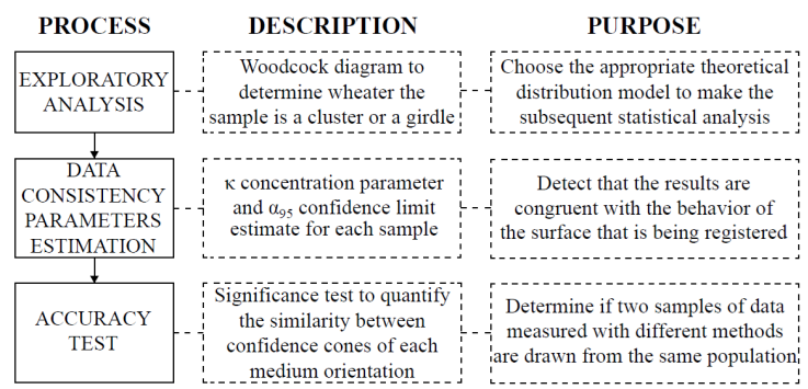 One of our methodology’s applications is to validate discontinuity surfaces from point clouds obtained with remote sensing tools using steps 1 and 2. Additionally, if control measurements are available, step 3 helps us calibrate and compare the data objectively and quantitatively.