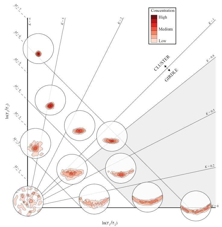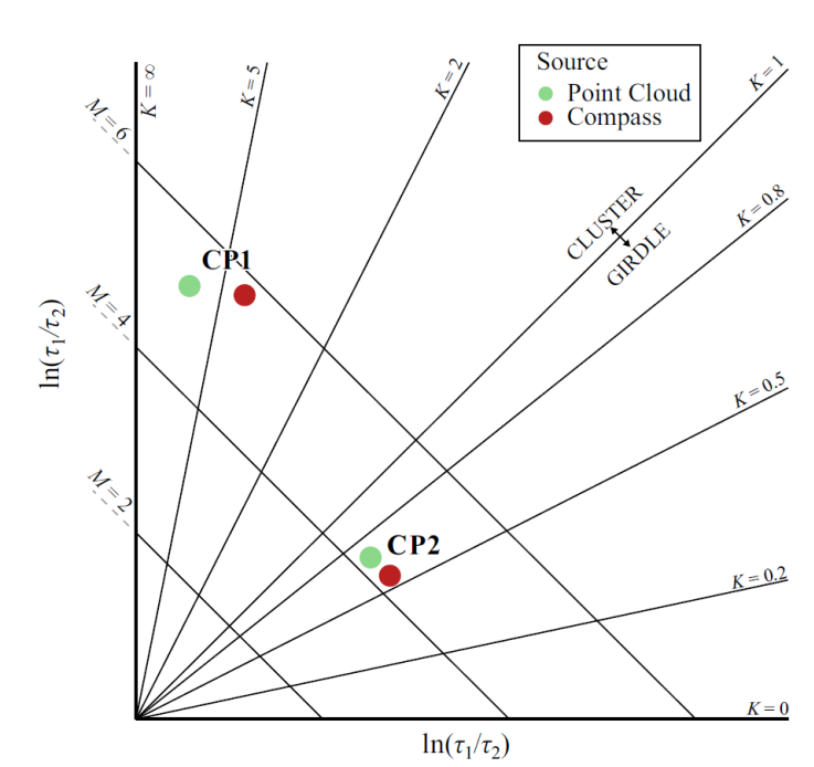 The normalized eigenvalues are ingested into a plot whose coordinate system has the comparison between τ 1 and τ 2 in the vertical axis and the comparison between τ 2 and τ 3 in the horizontal axis, forming Woodcock’s diagram (Figure 3). On the one hand, the degree of fit to a plane is indicated by the parameter M (Equation 4). The larger the M, the more coplanar the poles, regardless of their symmetry around a point (girdle) or around an axis (cluster).