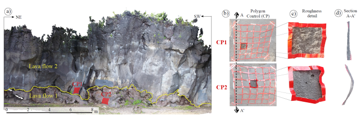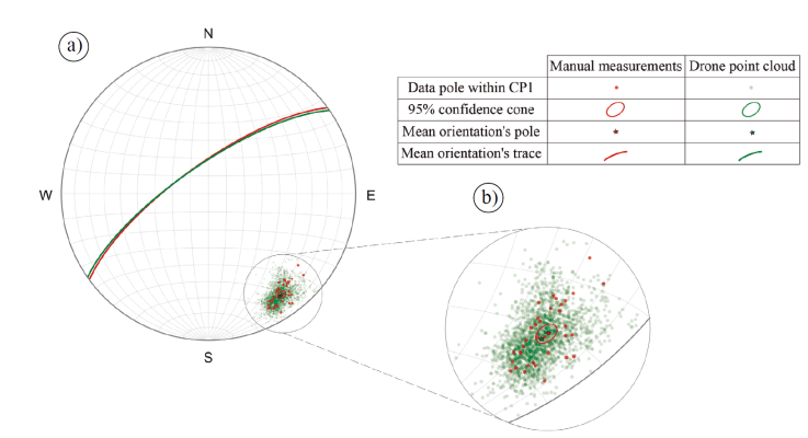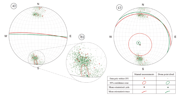 However, α 95 values in our study differ by almost 2° between the manual and the point cloud measurements α 95 (manual) = 2.07° and α 95 (point cloud) = 0.28°, which means that the value of the mean orientation from the point cloud is of greater confidence. This contrast is observed when comparing the confidence cones’ size in Figure 6b and is partly due to the large amount of data from the point cloud to capture the flat surface CP1.