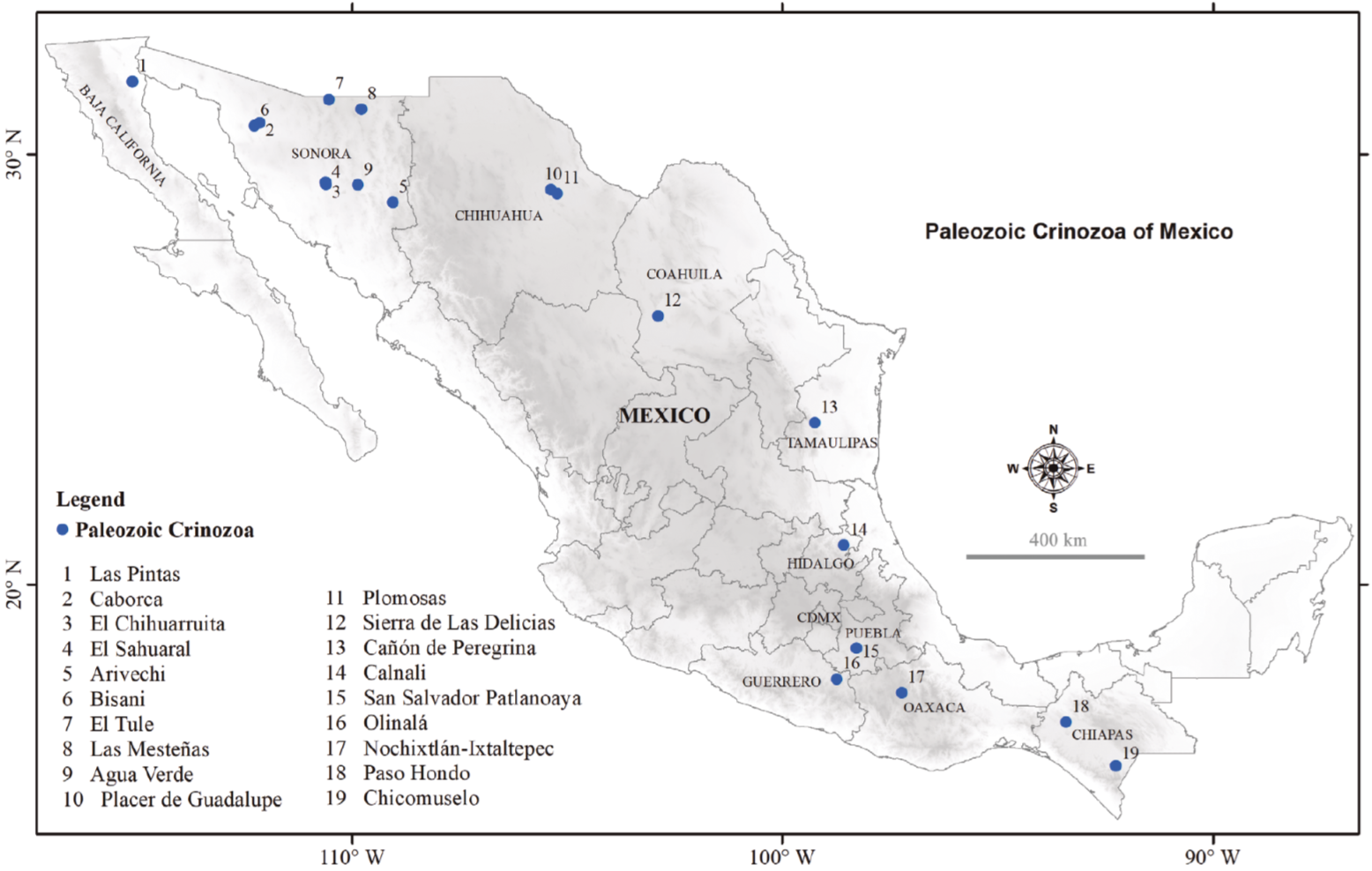 The outcrops containing Paleozoic rocks in Mexico are found in the states of Sonora (Arivechi, Bisani, El Tule, Sierra Agua Verde, La Proveedora, Las Norias, Placeritos, Pozo Nuevo, and San José de Gracia), Chihuahua (Placer de Guadalupe), Tamaulipas (La Peregrina Canyon) located in the northern region of the country; while in the central-south zone they are exposed in the states of Hidalgo (Calnali), Puebla (San Salvador Patlanoaya), Guerrero (Olinalá), Oaxaca (Nochistlán-Ixtaltepec) and Chiapas (La Concordia, Chicomuselo and Aguacate River).