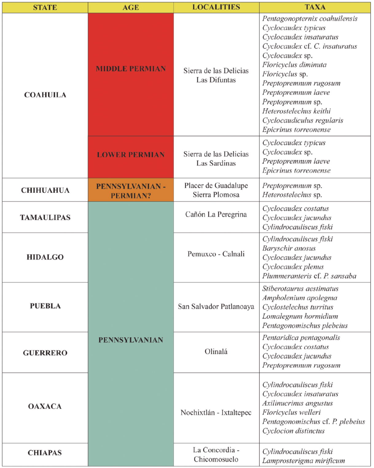 The data included in this paper is organized by location, and geologic period; also, the stratigraphy, ecology and paleogeographic conditions during the sedimentation is provided (Figures 2 and 3). The classification used is based on Guensburg and Sprinkle (2003) and Wright et al. (2017).