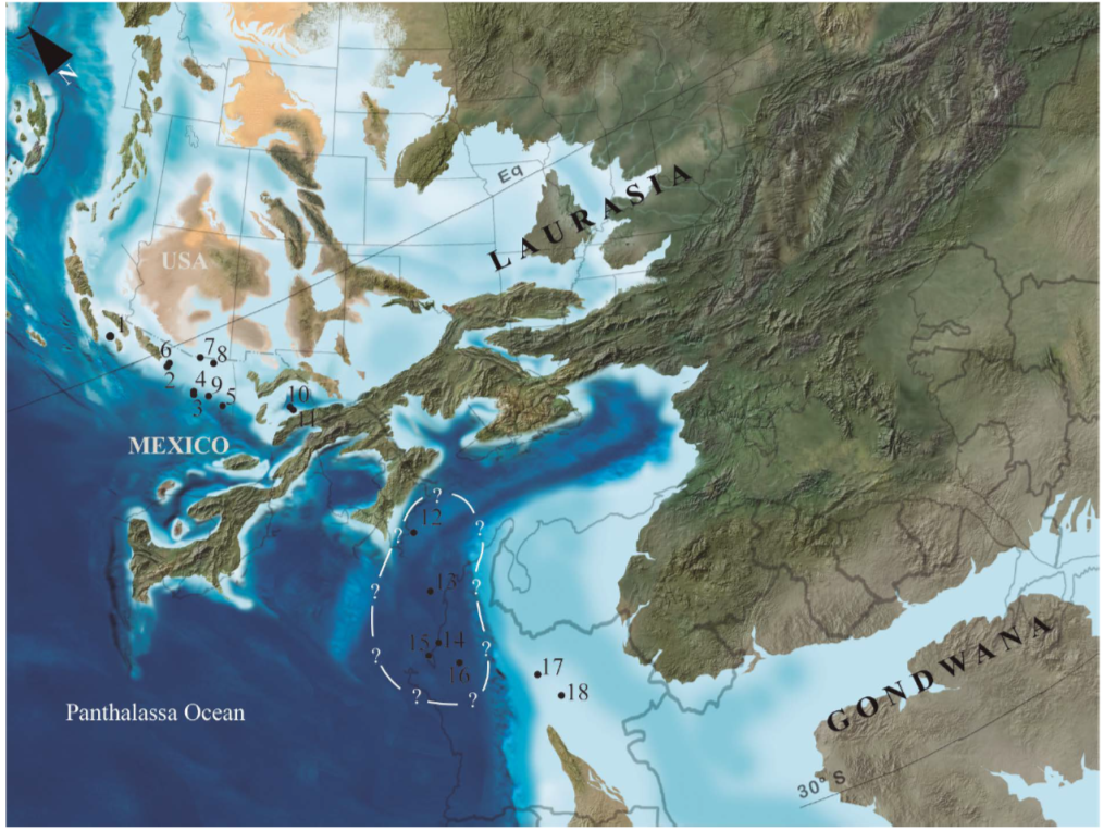 Figure 5 Possible paleogeographic location during Pennsylvanian of the sequences included in this study. 1: Las Pintas, 2: Caborca, 3: El Chihuarruita, 4: El Sahuaral, 5: Arivechi, 6: Bizani, 7: El Tule, 8: Las Mesteñas, 9: Agua Verde, 10: Placer de Guadalupe, 11: Plomosas, 12: Sierra de Las Delicias, 13: Cañón de Peregrina, 14: Calnali, 15: San Salvador Patlanoaya, 16: Olinalá, 17: Nochixtlán-Ixtaltepec, 18: Paso Hondo, 19: Chicomuselo. Paleogeographic map modified after ©2013 Colorado Plateau Geosystems, Inc.
