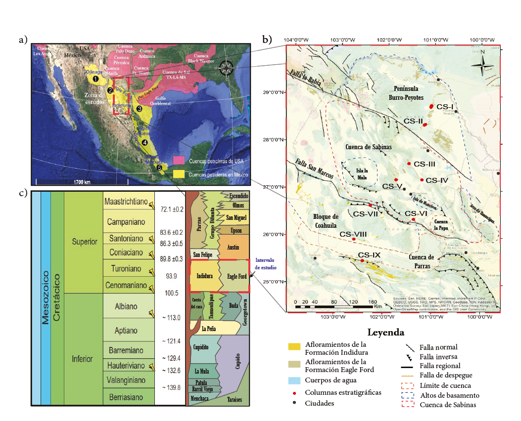 Ambas formaciones sedimentarias incluyen el OAE-2, dentro del límite Cenomaniano-Turoniano (Haq et al., 1987; Robaszynski et al., 2010), correlacionándose temporalmente. La Formación Eagle Ford se localiza en la cuenca de Sabinas, mientras que la Formación Indidura aflora en la Sierra Madre Oriental. También se correlacionan con las formaciones Ojinaga en la cuenca de Chihuahua, Agua Nueva en la cuenca Tampico Misantla, Soyatal al oeste de la cuenca Tampico Misantla, Orizaba y Maltrata en la cuenca de Veracruz y Cintalapa del Grupo Sierra Madre en Chiapas (Santamaría-Orozco et al., 1991; Martínez et al., 2000; De Antuñano et al., 2001; Sánchez-Bermeo et al., 2002; Enciso-Cárdenas, 2015; entre otros). En la cuenca de Sabinas, el contacto superior entre la Formación Eagle Ford y Austin está definido por un hiato regional (Mancini y Puckett, 2005) y un contacto transicional que ha sido difícil de determinar en campo. En cambio, el contacto inferior con la Formación Buda está claramente definido por el cambio de color y texturas de las rocas calcáreas, mientras que hacia la cuenca de Parras la Formación Indidura sobreyace a la Formación Aurora en un contacto que puede ser transicional o abrupto (Kelly, 1936; Sellards, et al., 1966).