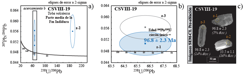 Figura 9 Edades U-Pb en la muestra clave CSVIII-19. a) Gráfico de concordia tipo Tera Wasserburg mostrando todos los datos de los granos de circón analizados; b) esta imagen corresponde a un acercamiento del gráfico a, en ella también se muestra la edad 206Pb/238U de un cristal único de circón de 96.8 ± 2.3 Ma. En esta muestra tenemos tres granos de circón y la elipse de color azul representa el grano de circón utilizado para estimar la edad de la muestra; c imágenes de catodoluminiscencia de granos de circón presentes en la muestra obtenidos por SEM, donde se observan las edades 206Pb/238U y puntos de ablación.