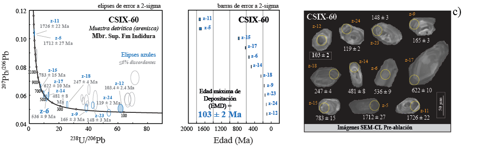 Figura 11 Edades U-Pb en la arenisca clave CSIX-60. a) Gráfico de concordia tipo Tera Wasserburg mostrando todos los datos de los granos de circón analizados, las elipses de color gris representan granos de circón más discordantes, plomo común y/o pérdida de plomo; b) gráfico con las edades más próximas a la edad 206Pb/238U máxima de deposición de 103 ± 2 Ma.; c) imágenes de catodoluminiscencia de granos de circón de la muestra obtenidos por SEM, también se observa el punto de ablación donde se llevó a cabo cada análisis.