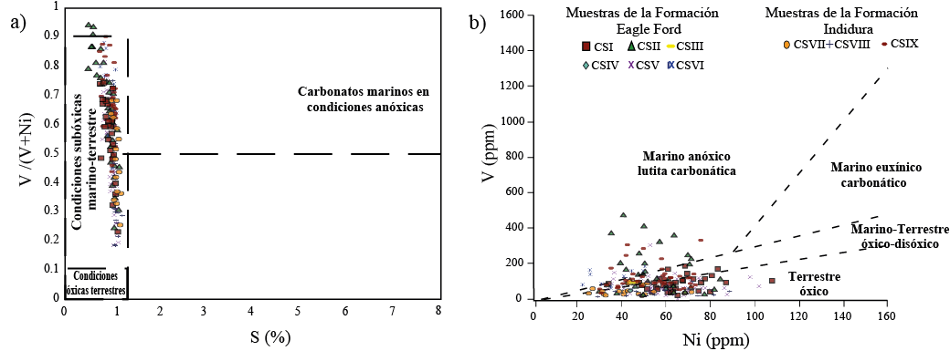 Figura 12 a) Gráfico de las proporciones de elementos traza de V/(V+Ni) versus el contenido de azufre en porcentaje (S %), que muestra que las condiciones de deposición de las rocas generadoras son similares y que se depositaron en condiciones subóxicas marino-terrestres (Lewan, 1984. Gráfico tomado de Al-Khafaji et al., 2020 ). b) Zonación gráfica de las concentraciones de vanadio (V) y níquel (Ni) para interpretaciones paleoambientales (Galarraga et al., 2008), que muestra variaciones entre condiciones óxicas, óxido-disóxicas y anóxicas de las Formaciones Eagle Ford e Indidura, donde las columnas CSII, CSV, CSVI, CSIX caen en condiciones mayormente marino-anóxicas.