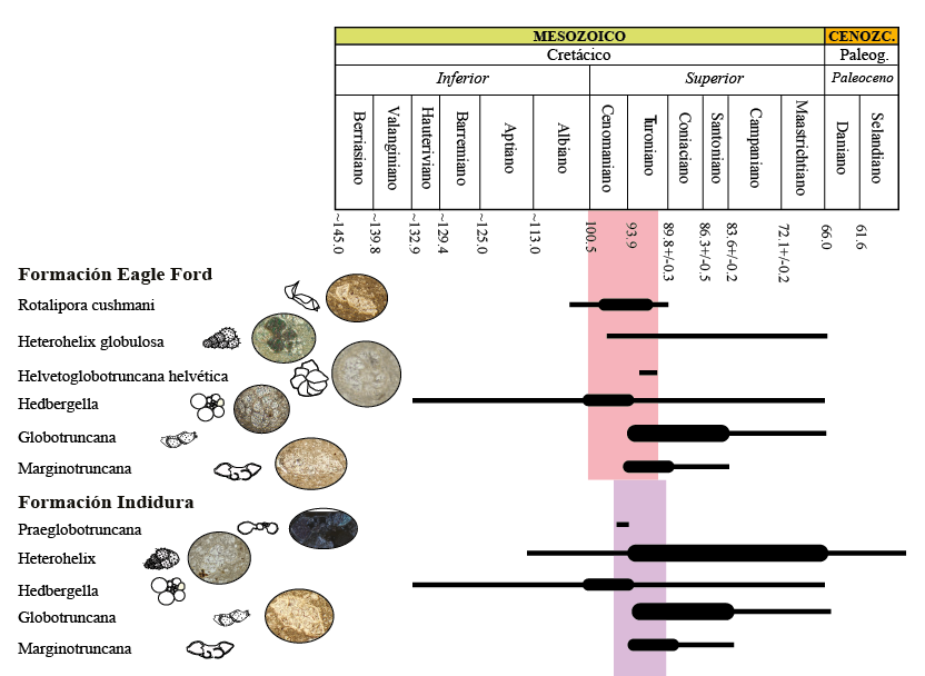 Figura 2 Edad bioestratigráfica calculada a partir del registro de foraminíferos planctónicos presentes en las Formaciones Eagle Ford e Indidura. El miembro superior está marcado por la aparición de la Helvetoglobotruncana helvética y en el miembro inferior por la presencia de la Praeglobotruncana del Cenomaniano tardío.