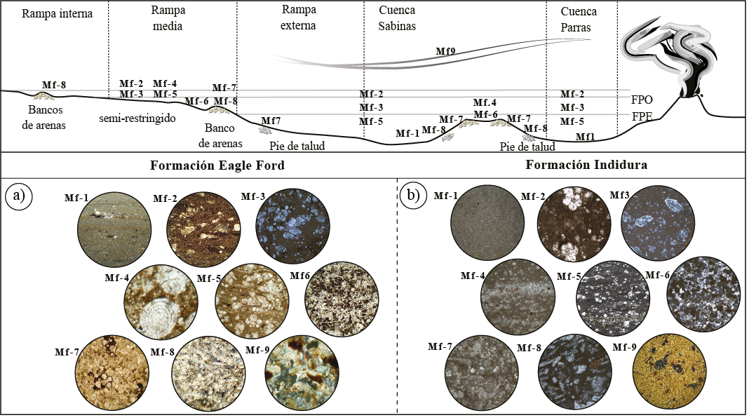 En la Formación Eagle Ford se reconocen nueve microfacies (Mf): la Mf-1 que está conformada por mudstone con escasos foraminíferos planctónicos (5-10 %); la Mf-2 por lutita y wackestone con foraminíferos oportunistas; la Mf-3 por lutita y wackestone con foraminíferos especialistas; la Mf-4 por wackestone y packstone de radiolarios; la Mf-5 por packstone con filamentos; la Mf-6 por grainstone peloidal; la Mf-7 por grainstone bioclástico, la Mf-8 conformada por calcarenitas bien cementadas y la Mf-9 por tobas volcánicas (Figura 3a).
