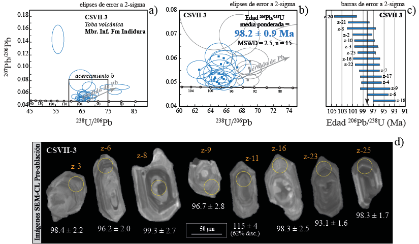 Figura 5 Edades U-Pb en la muestra clave CSVII-3. a) Gráfico de concordia tipo Tera Wasserburg mostrando todos los datos de los granos de circón analizados; b) Esta imagen corresponde a un acercamiento del gráfico a, en ella se muestra la edad 206Pb/238U media ponderada de 98.2 ± 0.9 Ma; c) Gráfico con el numero de granos de circón utilizados para calcular la media ponderada; d) Imágenes de catodoluminiscencia de granos de circón representativos con formas subhedrales y núcleos heredados.