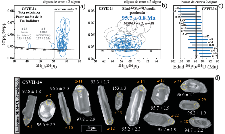 Figura 6 Edades U-Pb en la muestra clave CSVII-14. a) Gráfico de concordia tipo Tera Wasserburg mostrando todos los datos de los granos de circón analizados; b) Esta imagen corresponde a un acercamiento del gráfico a, en ella también se muestra la edad 206Pb/238U media ponderada de 95.7 ± 0.8 Ma. Las elipses de color azul son las que fueron empleadas para calcular la edad media ponderada. c) Gráfico de las edades de los 15 granos de circón utilizados para calcular la media ponderada de 95.7 ± 0.8 Ma; d) Imágenes de catodoluminiscencia de granos de circón con formas subhedrales alargados y sus anillos de crecimiento.