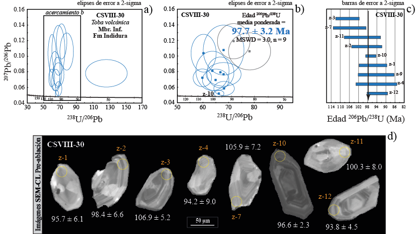 En la columna VII, la muestra CSVII-3 presenta un total de 24 circones analizados, la agrupación de los análisis concordantes nos permite calcular la edad 206Pb/238U media ponderada de 98.2 ± 0.9 Ma (2 sigma; MSWD = 2.5; Figura 5), edad que corresponde al Cenomaniano temprano. La muestra CSVII-14 presenta un total de 29 granos de circón, los cuales nos permiten calcular una edad 206Pb/238U media ponderada de 95.7 ± 0.8 Ma (2 sigma; MSWD = 2.2, Figura 6) edad que corresponde al Cenomaniano tardío. Esta edad es interpretada como contemporánea a la deposición del sedimento de la Formación Indidura con algunos granos de circón que llegaron a la cuenca transportados con el sedimento. La muestra CSVII-34 presenta un total de 25 granos de circón con una media ponderada de 96.6 ± 0.9 Ma (2 sigma; MSWD = 2.4; Figura 7), edad que corresponde al Cenomaniano tardío y es ligeramente mayor a la esperada para el miembro superior, pero de utilidad por el rango que proporciona su error.