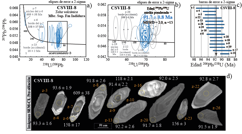Figura 10 Edades U-Pb en la muestra clave CSVIII-8. a) Gráfico de concordia tipo Tera Wasserburg mostrando todos los datos de los granos de circón analizados; b) esta imagen corresponde a un acercamiento del gráfico A, en ella también se muestra la edad 206Pb/238U media ponderada de 91.7 ± 0.8 Ma. Las elipses de color gris representan herencias de granos de circón, plomo común y/o pérdida de plomo; c) gráfico de las edades de granos de circón utilizados para calcular la media ponderada; d) imágenes de catodoluminiscencia de granos de circón representativos de la muestra obtenidos por SEM.