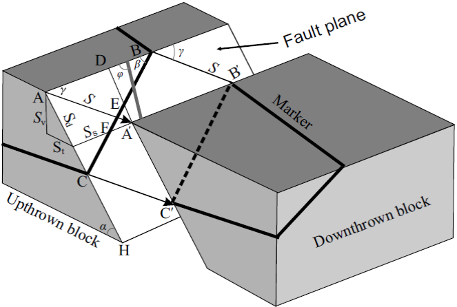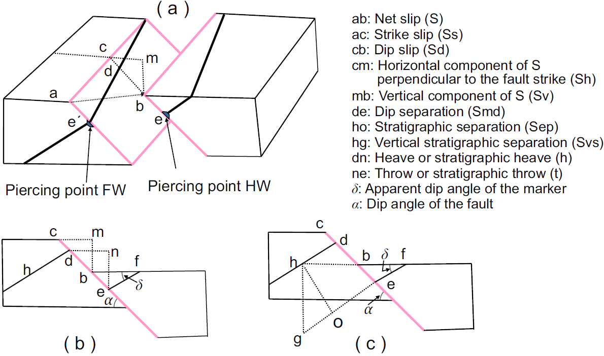 Figure 1 (a) Block diagram showing displaced surface by an oblique-slip fault. Detaied components of fault slip are shown. Pircing points in the hanging wall (HW) and footwall (FW) are marked. (b) Vertical cross-section perpendicular to the fault strike showing the dip-slip (cb) and dip-separation (de) and their components, respectively. (c) Vertical cross-section perpendicular to the fault strike showing the vertical stratigraphic separation (hg or S vs).