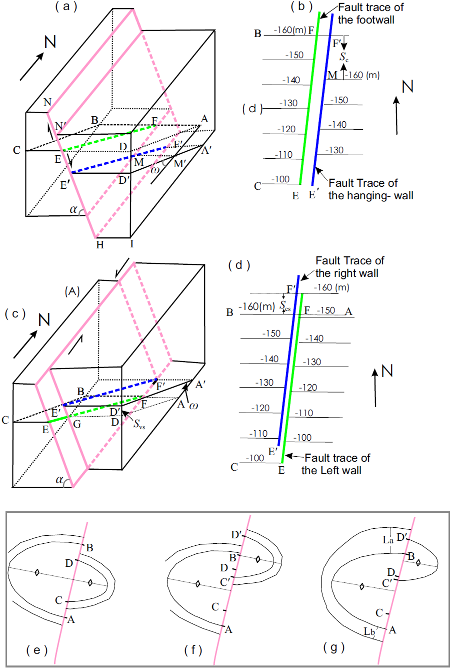 The methods include the cases of displaced fold and displaced bed. In the case of displaced bed (Figures 2a, 2b), the vertical component (S v ) of the fault slip can be estimated from the offset (S c ) of contours by the equation S v = S c tanω. The dip-slip (S d ) of the fault can be estimated as S d = S v /sinα = S c tanω/sinα. In the case of a displaced symmetric fold (Figure 2f), the strike component (S s ) of the fault slip is calculated by the equations S s = (S max +S min ) / 2 and the dip slip (S d ) can be calculated by the equation S d = (S max -S min ) tanω/2 sinα. In the case of a displaced asymmetric fold (Figure 2g), the strike-slip component is expressed by Ss= (n S min +S max )/(n + 1).