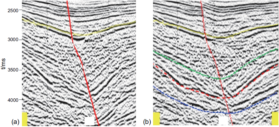 Figure 3 Example for determination of strike slip using fault-perpendicular seismic reflection profiles (modified from Mu and Zhao, 2021). (a) An arbitrarily profile selected perpendicular to the strike-slip fault. Two parts are designed: Hanging wall (right) part and footwall (left) part. (b) The hanging wall from another profile is spliced to the footwall in (a).