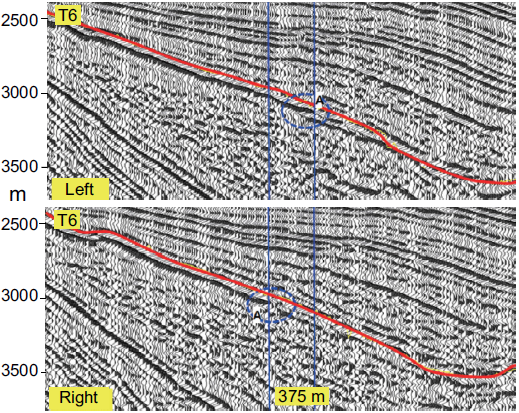 Another method is the comparison of reflection characteristics of parallel seismic profiles on both sides of the fault. Two fault-parallel profiles adjacent to the fault are aligned according to their geographic positions to find characteristic points or displaced points. The two profiles are assigned left and right, respectively (Figure 4). In this figure, the characteristic points (piercing points) showing in blue circles are the stratigraphic discontinuity points A and Aʹ. The horizontal distance between two points A and Aʹ with the same characteristics is the strike slip of the fault. The strike slip in the example of Figure 4 is 375 m.