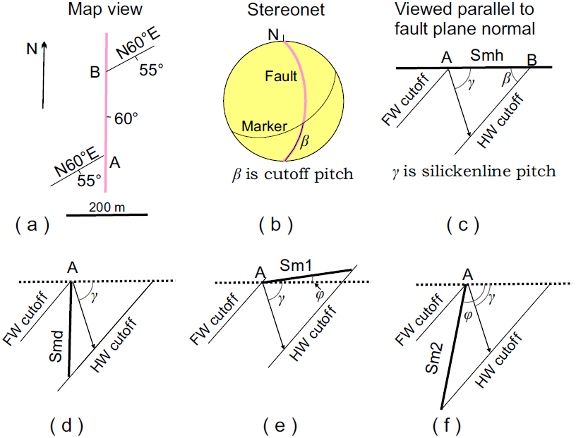Figure 5 Example of determining fault slip in the case of knowing the slip vector and one marker. (a) Geological map. (b) Stereogram. (c) Determination of the fault slip when knowing the strike-separation and slip vector on the fault plane. (d) Determination of the fault slip when knowing the dip-separation and slip vector on the fault plane. (e) and (f). Determination of the fault slip when knowing an arbitrary separation and slip vector on the fault plane. γ pitch angle of the slip, β pitch angle of the cutoff of the marker, φ pitch angle of the observation line.