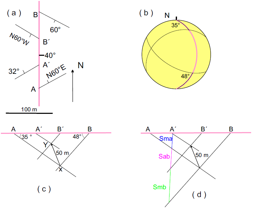 Figure 7 Example of determining fault slip in the case of obtaining two markers. (a) Geological map. (b) Stereogram. (c) Determination of the fault slip when knowing the strike-separations on the fault plane. (d) Determination of the fault slip when knowing arbitrary separations on the fault plane.