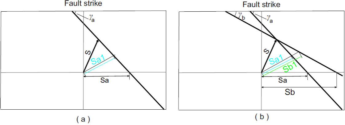 The separation-pitch diagram proposed by Lisle and Walker (2013) is also used to estimate fault slip from map data. This method can be also applied in arbitrary case that is shown in Figure 7. In the case of one marker and the slip direction, if a separation in any direction on the fault (S a1 ) is known, the net slip can be measured as shown in Figure 8a. On this graph, the point in the measured direction is determinated by the measured separation S a1 and the angle of pitch of the marker, with the slip sense considering the viewing direction (γ a ). The drawn line is called the solution line, which represents a possible solution for the net slip of the fault (Lisle and Walker, 2013). Net displacement is the distance from end of Sa1 and the solution line, measured in the slip direction. Similarly, in the case of two markers, two separations along a direction on the fault (S a1 and S b1 ) are known, the intersection point of two cutoffs determine the slip direction and the net slip (Figure 8b).