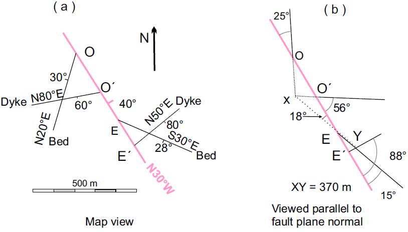 Figure 9 Example to determine fault slip in the case of two markers not- parallel on the two sides of the fault. (a) Geological map. (b) Plane map on the fault surface.