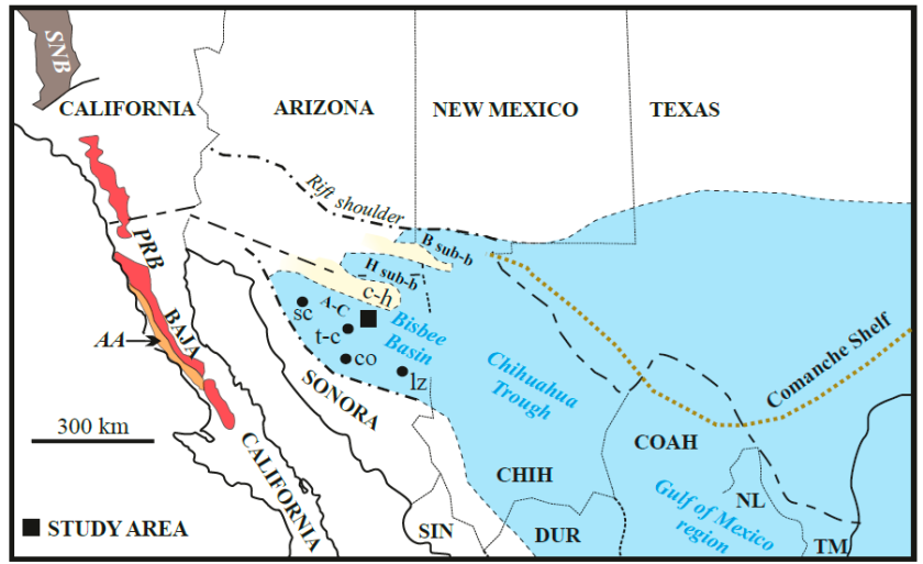 The latest Jurassic-Early Cretaceous Bisbee basin in the border region of southwestern North America records extensional tectonic and sea-level events that were associated with the westward migration of the Jurassic continental magmatic arc and with the opening of the Gulf of Mexico (Dickinson et al., 1986; Lawton and McMillan, 1999). The lithologic succession and age of the Bisbee Group that was deposited in this basin document the continental source areas of its clastic sediments and the marginal Gulf of Mexico biostratigraphy that are recorded by several marine incursions. The Early Cretaceous Bisbee basin was located west of the stable Comanche shelf, on the northwestern margin of the Mesozoic Gulf of Mexico (Figure 1). The tectonic and stratigraphic history of this basin relates to the formation of the numerous tectonic blocks and platforms that now compose much of eastern and southern Mexico (Cantú Chapa et al, 1985; Martini and Ortega-Gutiérrez, 2018).