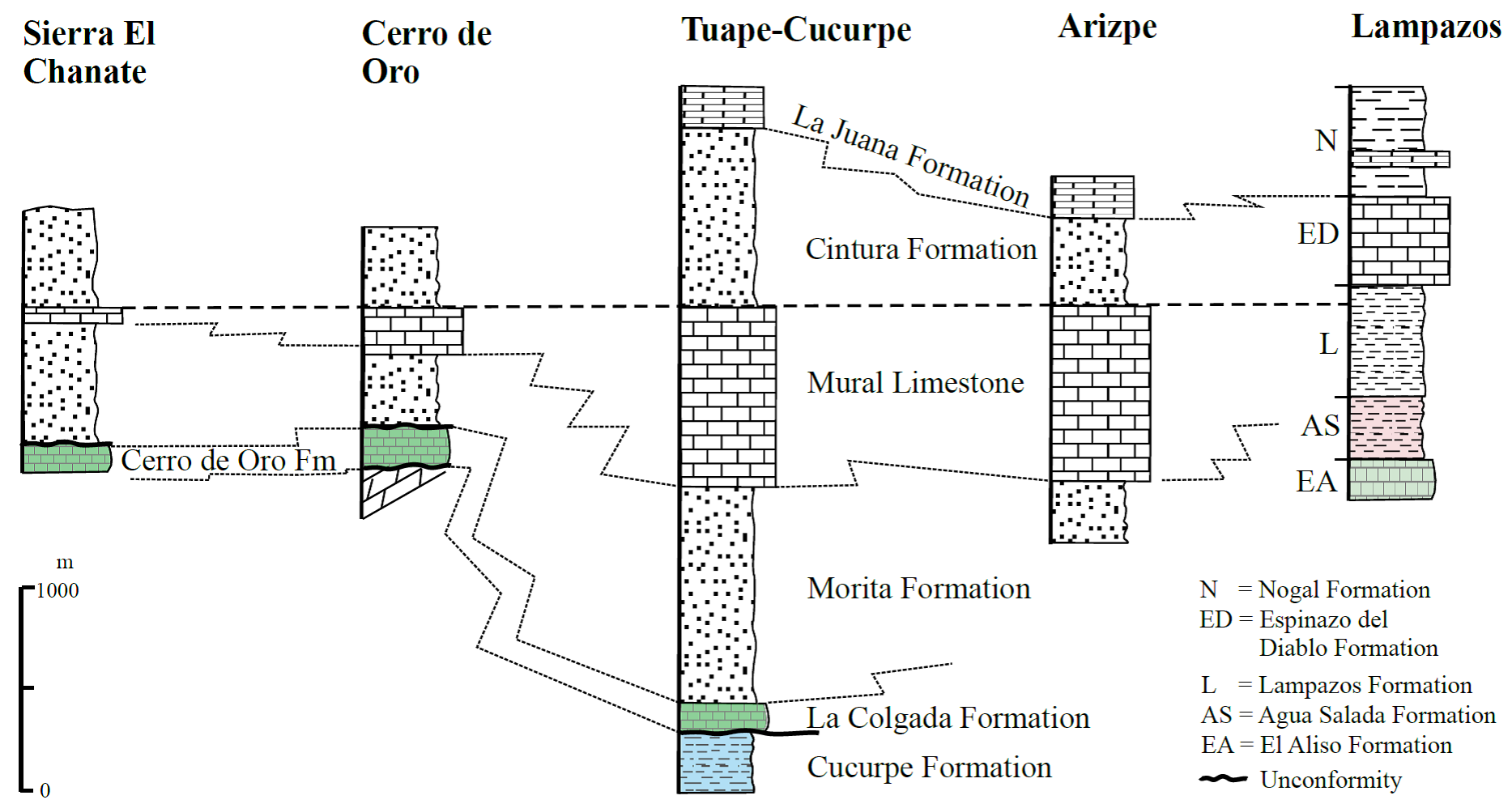 The stratigraphy of the Bisbee Group in the Arizpe area was reported by González León (1978), while Lawton et al. (2004) reported the detailed stratigraphy of the 900 m-thick Mural Limestone that crops out at Cerro La Ceja (Figure 3).