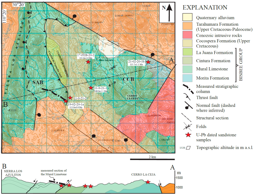 Figure 3 Geologic map of the Arizpe area showing outcrops of the Bisbee Group formations and younger units that include the Cocospera Formation, Tarahumara Formation, and a Tertiary granodioritic pluton. Locations, labels and maximum depositional ages of the dated sandstone samples are indicated. Transect of the measured stratigraphic column of the Mural Limestone (thick dash-dot line) reported in this work, and the structural profile along line A-B are shown. The Cordón de Enmedio thrust fault separates outcrops of the Bisbee Group into Cerro La Ceja (CCB) and Sierra Los Azulitos (SAB) blocks. The base map is taken from the 1:50000 topographic chart Arizpe H12B73 of INEGI (2001; https://www.inegi.org.mx/contenidos/productos/prod_serv/contenidos/espanol/bvinegi/productos/geografia/imagen_cartografica/1_50_000/702825649203.pdf).