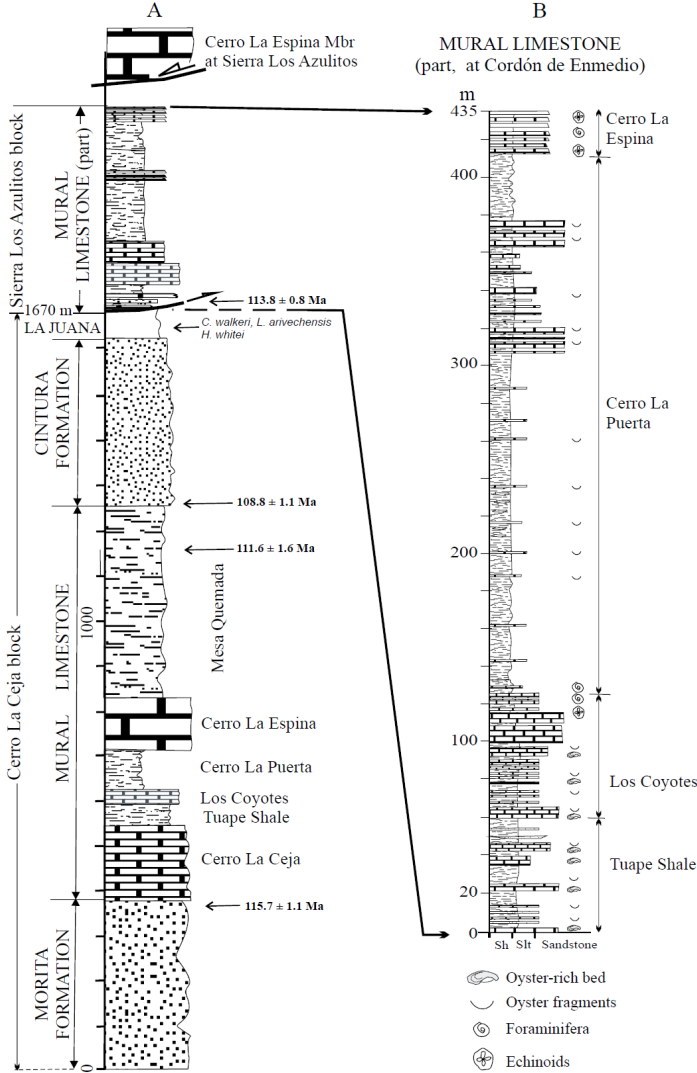 The biostratigraphic Aptian-Albian boundary (113.0 Ma; IUGS, 2020) has been proposed to fall within the lower part of the Mural Limestone close to the contact between the Tuape Shale and the Los Coyotes members (González-León et al., 2008), while the age of the boundary between the Mural Limestone and the Cintura Formation is younger than early Albian by biostratigraphy, but is not constrained by geochronology.