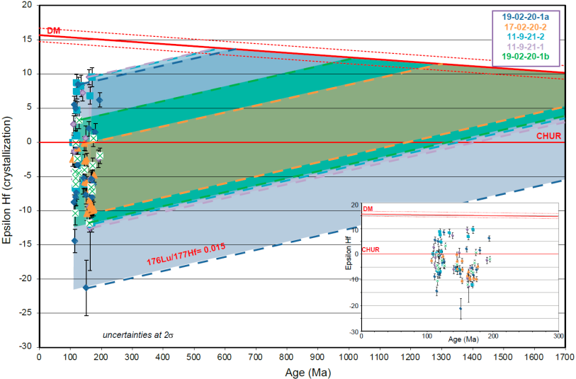 Lu-Hf isotopic data (Supplementary Table S2) were obtained from 15 to 20 detrital zircon grains of Jurassic and Early Cretaceous ages that were measured from each of the five dated sandstone samples. The ablated spots for Hf were the same used for the U-Pb geochronology analyses.