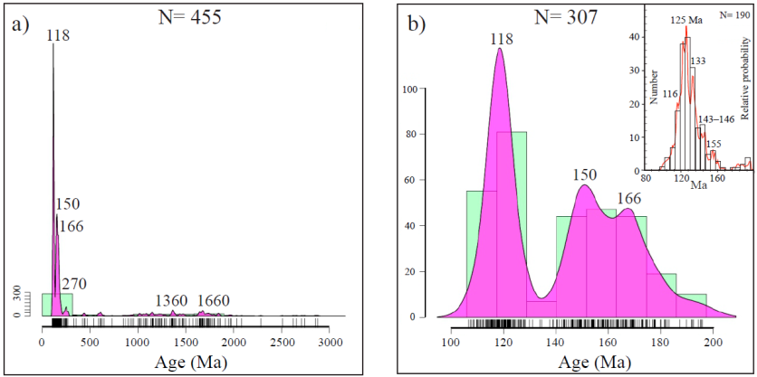 Figure 9 a) Kernel density estimator plot with age distributions for the total number of analyzed zircon from the Morita, Mural, and Cintura formations sandstone of the Bisbee Group in the Arizpe area. b) The KDE plot for the Cretaceous and Jurassic age groups shows the main age distributions. Inset in b): a histogram and relative probability density plot of detrital zircon ages (N = 190) reported by Alsleben et al. (2012) from the Cretaceous intra-arc and deformed successions in Baja California showing the main age distributions.