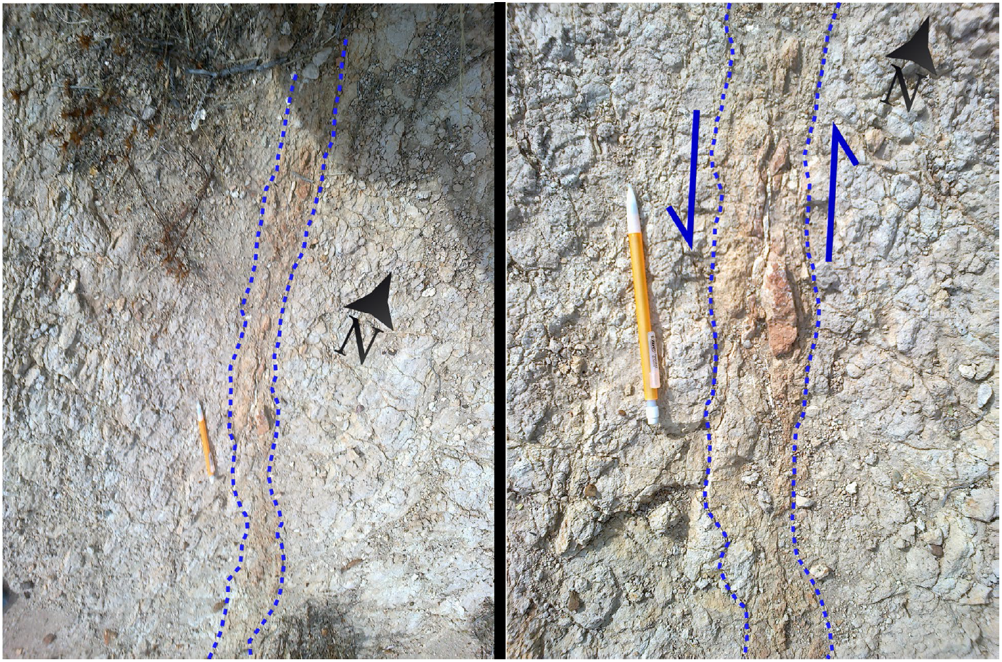 Figure 3 Photograph during fieldwork where both discontinuities are shown. The photographs were taken during the application of the ERT method.
