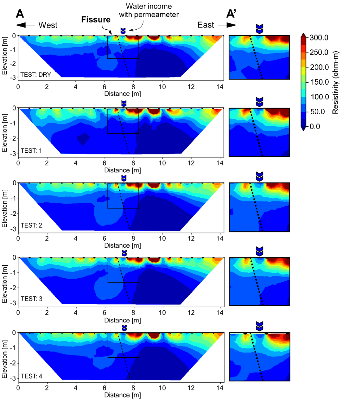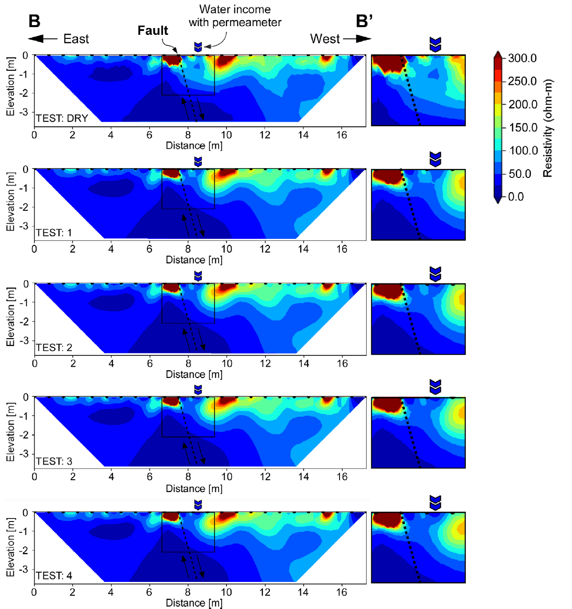 As mentioned above, several ERT tests were applied at four infiltration points concurrent to permeability tests, two points near the fracture (P4 and P2) and two near the fault (P1 and P3; Figure 2c). In total, five subsoil resistivity measurements were completed for each of the four selected points, one before the infiltration process and the remaining four were simultaneous to the infiltration of water. These ERT tests permitted to obtain profiles of resistivity with a prospecting depth close to 3.5 m and almost 14 - 17 meters long, with 20 electrodes placed at every 0.7 - 0.85 meters on the surface.