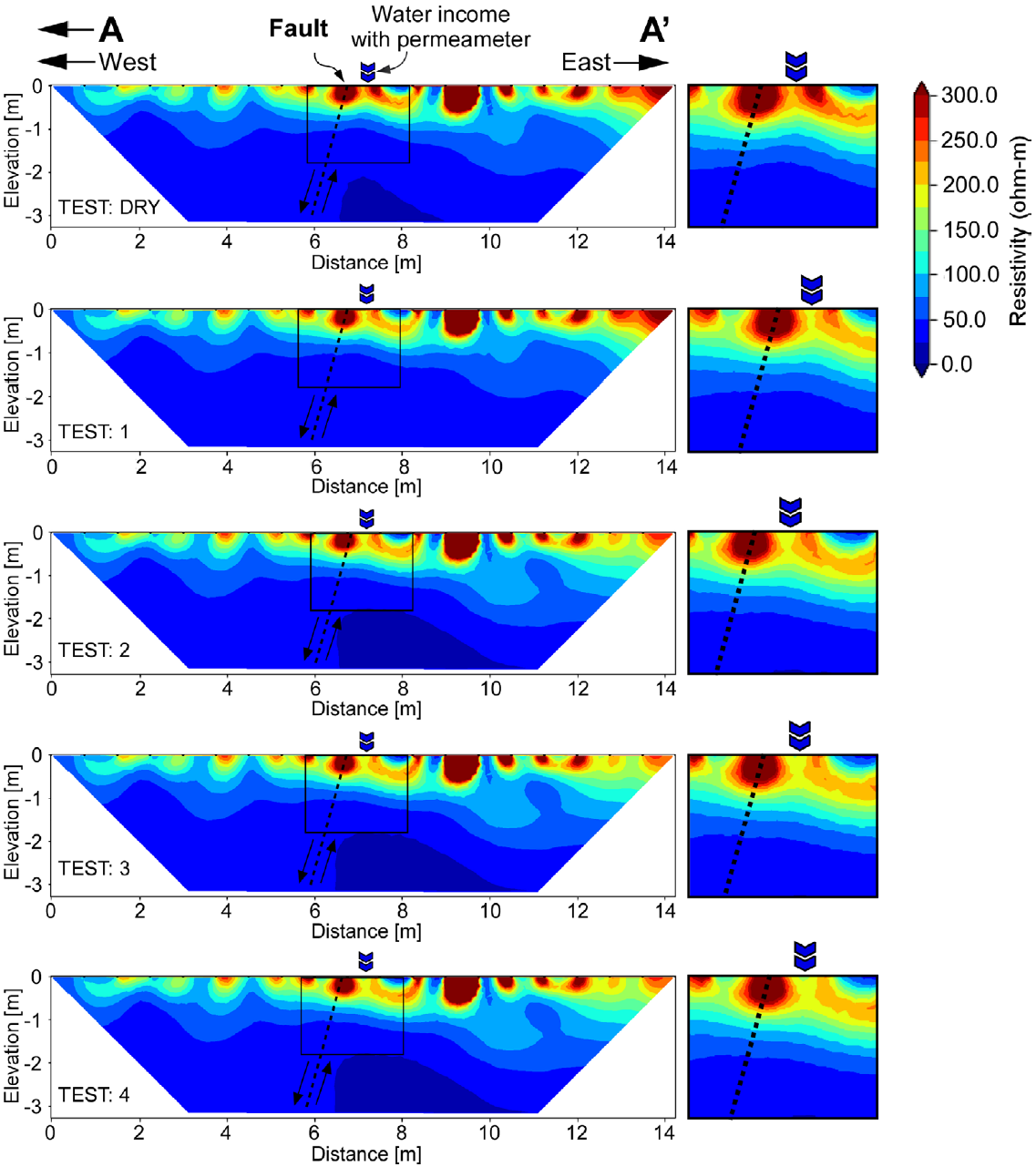 As shown in Figure 9, there is also a zone of very low resistivity (less than 25 Ω·m) that is located in a zone deeper than two meters and that can be associated with the fault plane, probably due to retained moisture near the fault. It can be noted that this low-resistivity zone (strong blue color) increased as more water entered through the permeameter, in fact, this area was larger in the last profile, this is, in the latest permeability test.