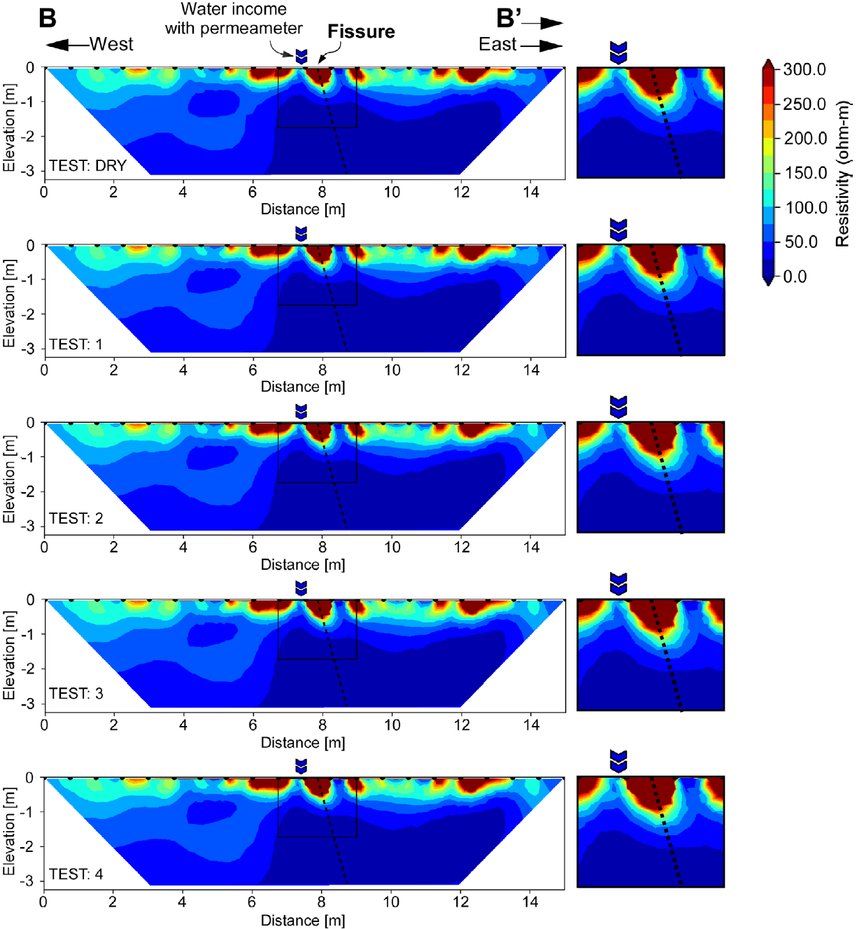 Figure 9 Results of the application of the five electrical resistivity tests in conjunction with that of permeability at the infiltration point P1. Unlike the other test points, in this particular point, the ERT profile was applied starting from the east in line B’-B (Figure 2c).