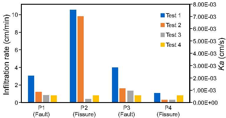 In general terms, the results obtained show that both parameters, the infiltration rate and hydraulic conductivity, increased in the soil adjacent to both discontinuities. Additionally, the plane of displacement of the discontinuities, in particular the fault, is presented as a preferential vertical flow channel, at least in the first meters of depth.