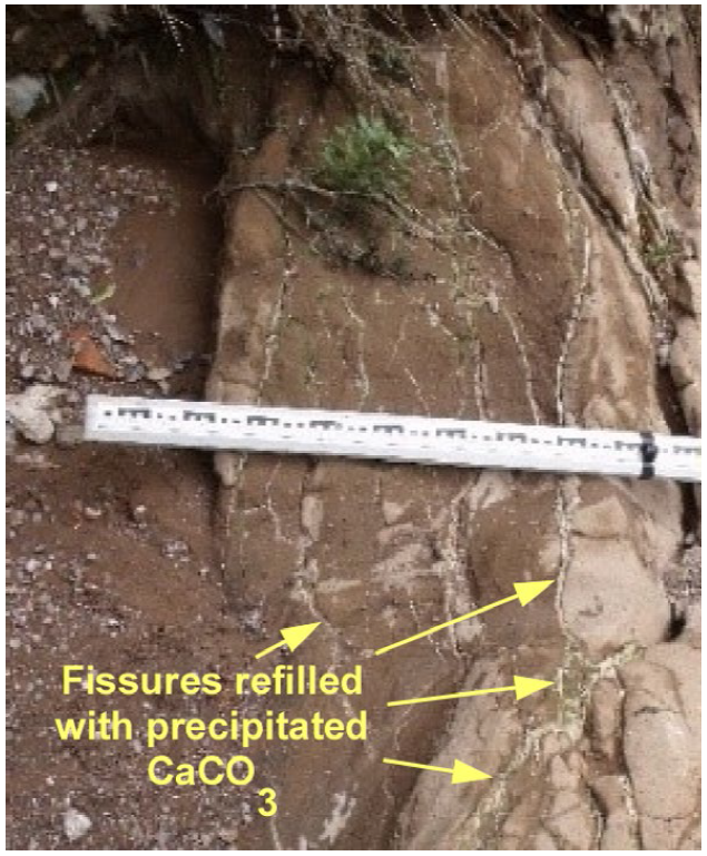 On the other hand, the analysis of hydraulic properties of subsoils influenced by geological discontinuities has been a topic extensively studied (for example, Caine and Forster, 1999; Bense and Person, 2006; Bense, et al., 2013; among others). It must be considered, however, that the conditions under which the hydraulic parameters are studied, particularly the conditions of the discontinuities, their geological environment and the scope and goal of the study are different for each particular case. For example, it is very common to find discontinuity analyses of regional scope for hydrocarbon studies, for which, understanding the hydraulic characteristics of both faults and fault zones is economically crucial for the oil industry. In hydrogeology studies, it is also important to understand the hydraulic characteristics of discontinuities to enhance the extraction of water of better quality and in greater quantity, as already specified previously. It is also common to find that the analyzed discontinuities are regional with several kilometers long, even, the analyzed structures are inactive at the time of the research. In this regard, the degree of activity or inactivity is a factor that could have relevance in the hydraulic properties of the zone affected by a discontinuity, not only increasing its porosity and permeability (by causing small fractures during the mechanic activity of the discontinuity), but also reducing them, through processes such as the closure of flow paths in the porous network by rearrangement of clasts or cataclysms (Heynekamp et al., 1999). In fact, the decrease in permeability can be more drastic when substances such as calcium carbonate are deposited by chemical precipitation on the spaces left during the rupture and rearrangement of sediments and rocks, or in small fractures associated with the main discontinuity. Figure 14 depicts filled fractures observed on an outcrop of the Oriente fault in the VA. Although this discontinuity is one of the most active in that valley, there are several points where the activity is negligible. According to Pacheco-Martínez et al., (2013), the time for these substances to be deposited in fractures in zones with the VA conditions is between 100 and 500 years, this particular point along the fault seemed to be accumulating strain. Over time, these filled cracks may rupture due to mechanical reactivation of the fault, or the filling substances may be diluted if any fluid interacts again with the medium. In these two cases the permeability of the fault could be affected again.