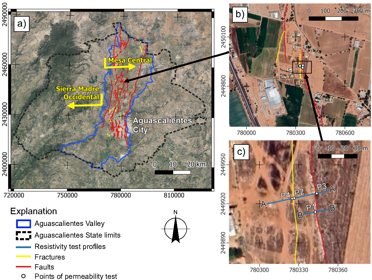 Figure 2 Study area at different scales. a) General view at the state and valley scale, including the relative position of the two main physiographic provinces. b) View of the study area at the community and urban scale. c) Close-up view of the experimental area. Points P1 to P4 indicate the location of the permeability tests. The blue lines A-A' and B-B' show where the ERT profiles were made. The general ERT profile and the permeability profile were made in line A-A', the latter by applying these tests at different points on this line.