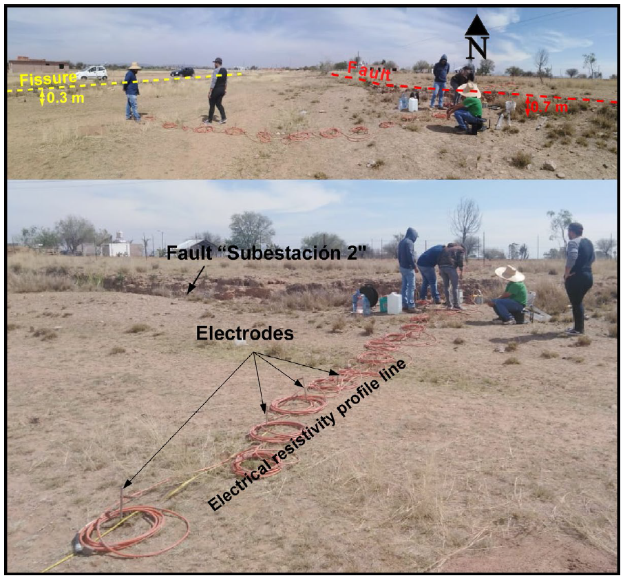 The specific study of this research was developed in the central part of the VA, in the municipality of Pabellon de Arteaga. This area was chosen due to three main reasons: 1) due to the permits granted by the owners for its realization, 2) because there was sufficient space for the management and implementation of the instrumentation, and 3) by the accessibility of the place so that the entrance of vehicles carrying the equipment was granted. The chosen study area was significant because it includes two adjacent discontinuities, a normal fault and a fracture, officially named by the state government as "subestación 2 fault” and "subestación 2 fracture", according to the information consulted in the Geological Faults and Cracks Information System (SIFAGG) https://www.aguascalientes.gob.mx/sop/sifagg/web/mapa.asp (Figure 2). According to this website, the length of the fault of this study is 495.98 m and is observed in the field as a structure with a surface vertical offset of up to 70 cm, a maximum opening of about 60 cm, a strike angle of 340° and a dip angle close to 86° toward the west. The sedimentary material observed in this fault is clayey silt with an upper layer of caliche with some rusty cemented soil. While the length of the fracture is 150.26 m and is located about 18 meters westward of the fault, with a maximum opening of about 30 cm, and strike angle of 355°, is observed in a segment close to 10 m long as a fault since it presents a vertical differential displacement of about 30 cm, with a dip angle of 89° toward the east, therefore forming a small graben with the fault. As mentioned above, this fault-fracture structural system is very common in the VA.